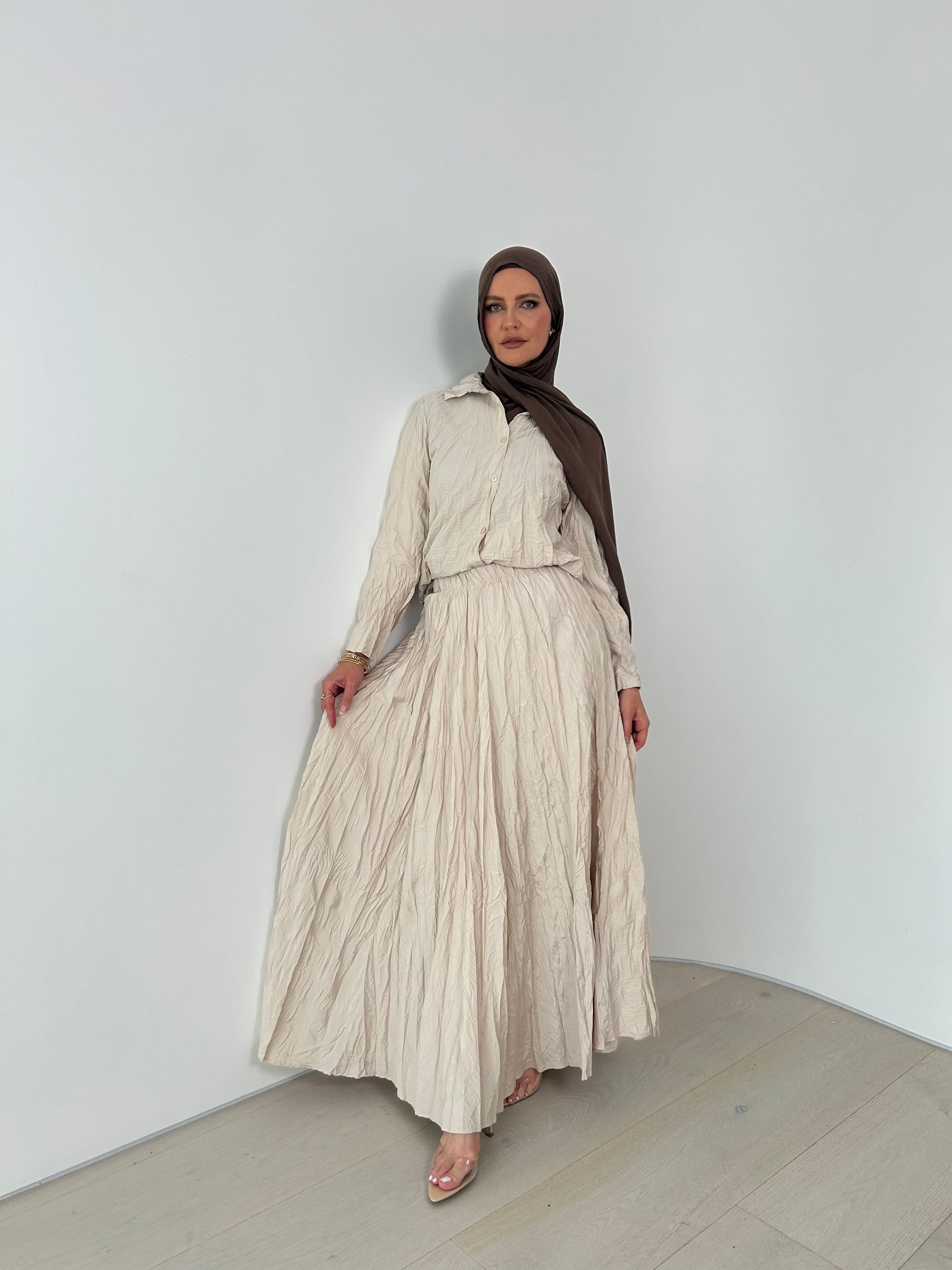 Elevate your wardrobe with this stunning crème 2 piece set, designed with modesty and elegance in mind. Crafted from a lightweight, breathable fabric, it ensures comfort without compromising on style. The full-length silhouette, button-down detail, and long sleeves make it perfect for various occasions, from casual outings to formal gatherings. Its versatile design allows you to dress it up with heels or keep it laid-back with flats, making it a must-have for any season.