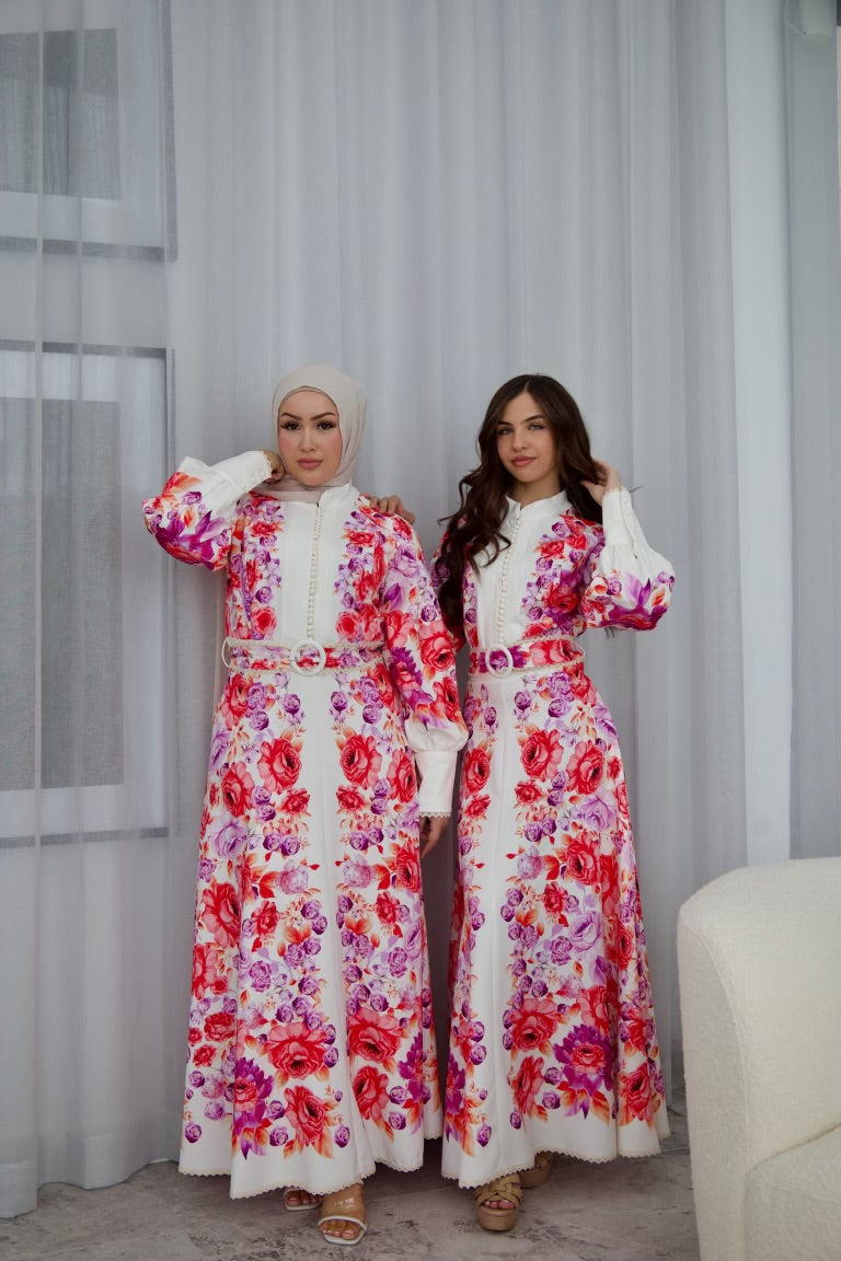 Introducing the Amore Dress – where grace meets enchantment. This dress features a pristine white base adorned with a captivating floral pattern in shades of pink, purple, and nudes. The high neck, adorned with buttons, the chic belt cinches the waist for a flattering silhouette.