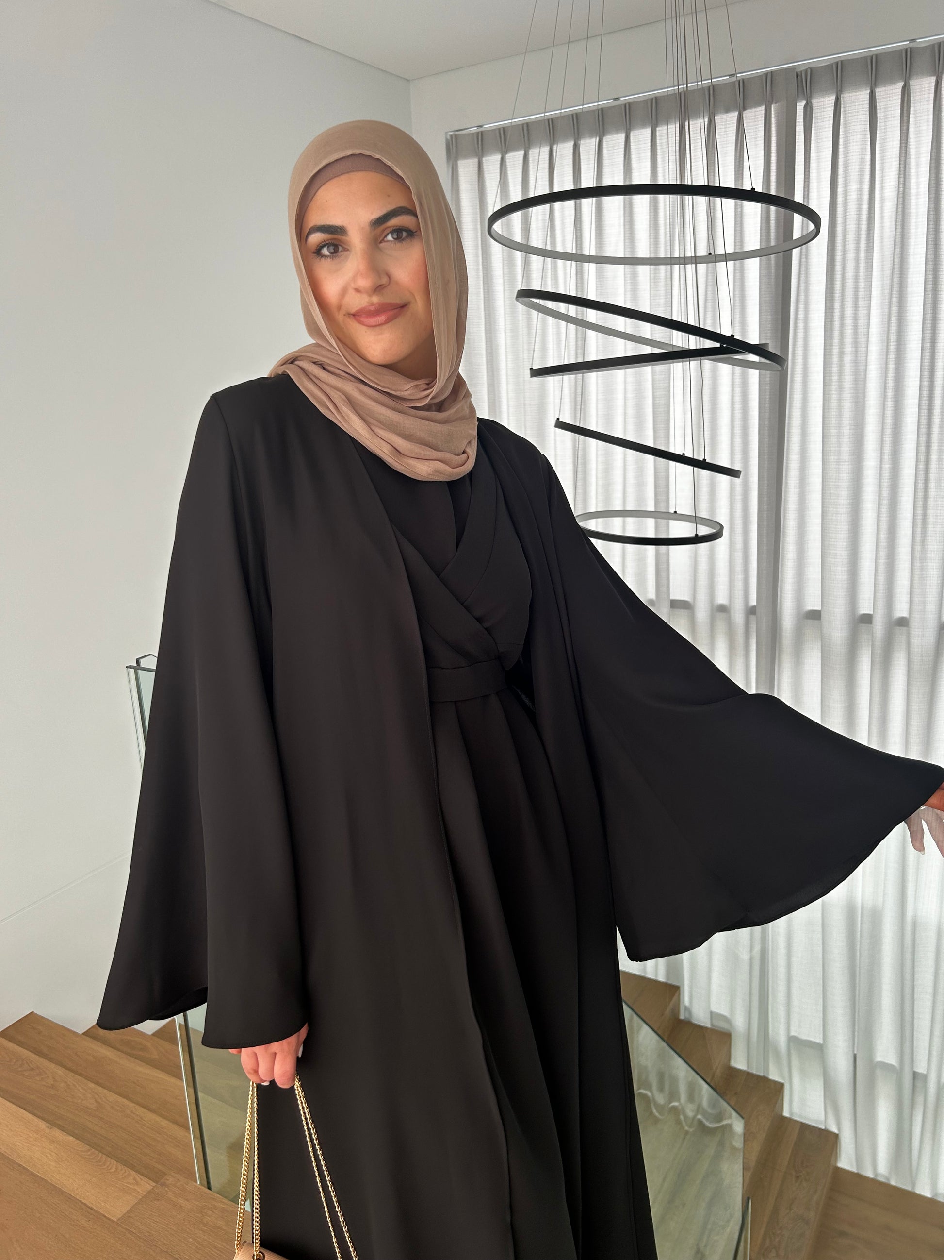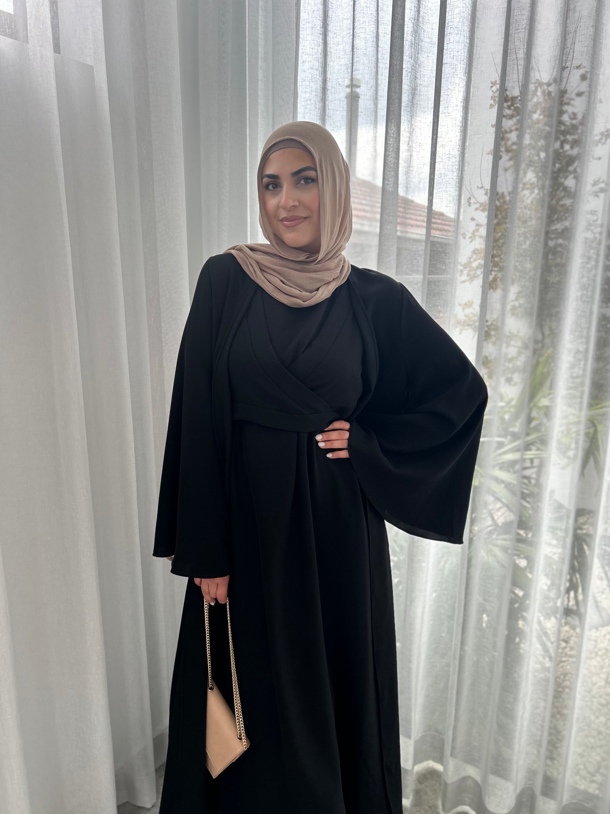 Discover elegance with our two-piece Mia set featuring a V-cut criss-cross design with a tie back feature for adjustable fitting.A sleeveless A-line dress and cardigan with flared arms. Perfect for making a statement at any occasion.