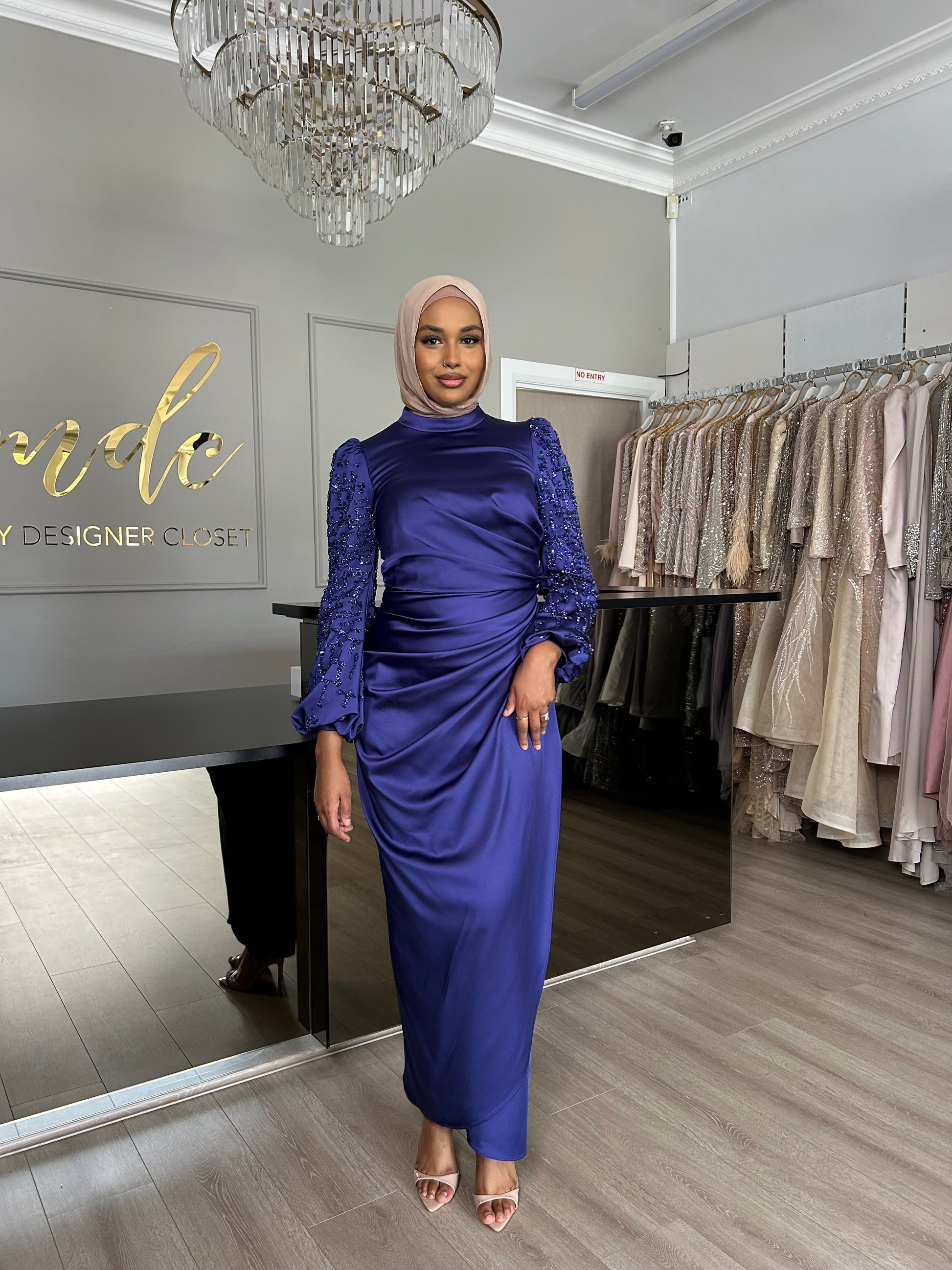 This stunning blue silk dress is the epitome of grace and sophistication. With its smooth, flowing fabric and flattering fit, it’s perfect for any special occasion. The bold design features the price elegantly displayed on the stomach and a striking heading on the sleeves, adding a unique and fashion-forward touch.