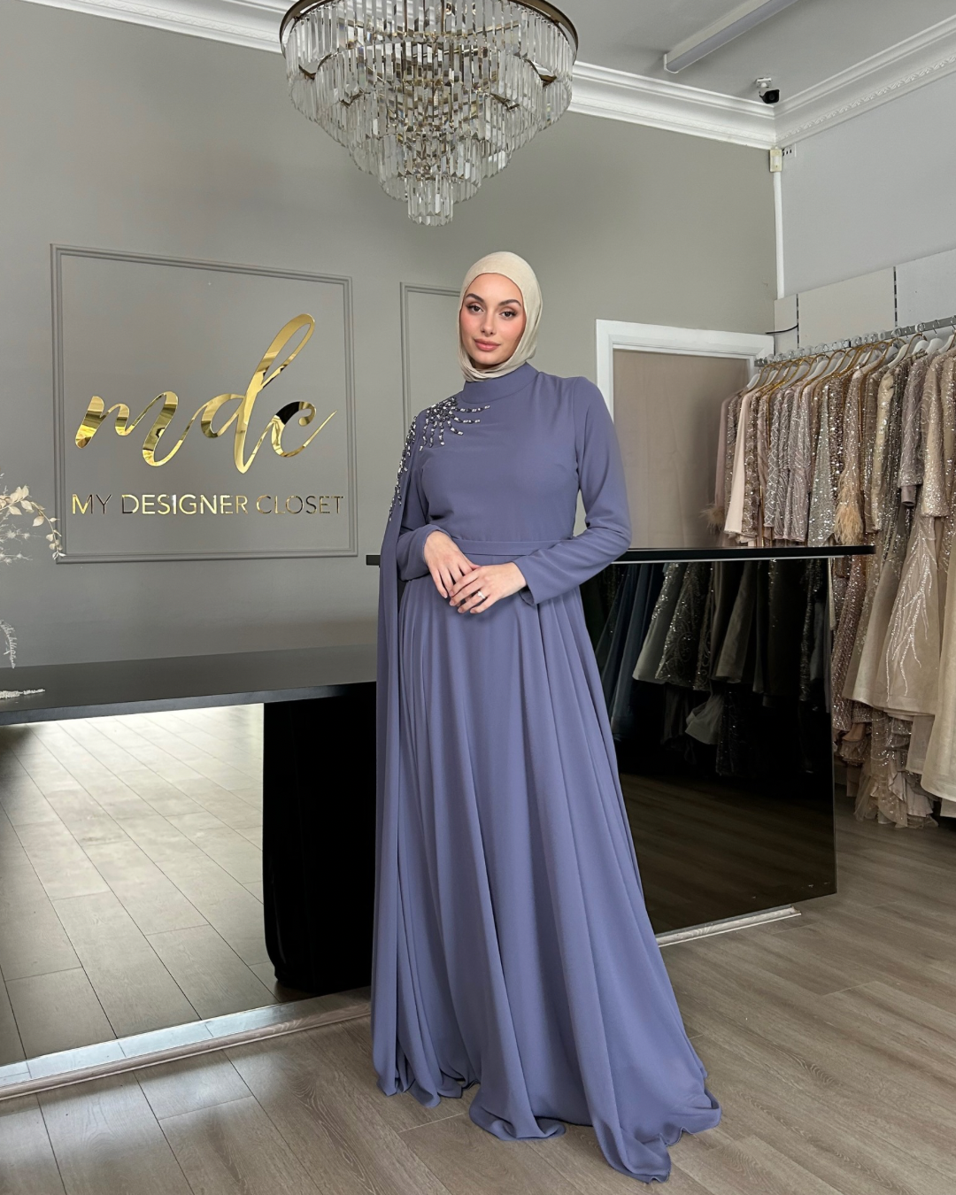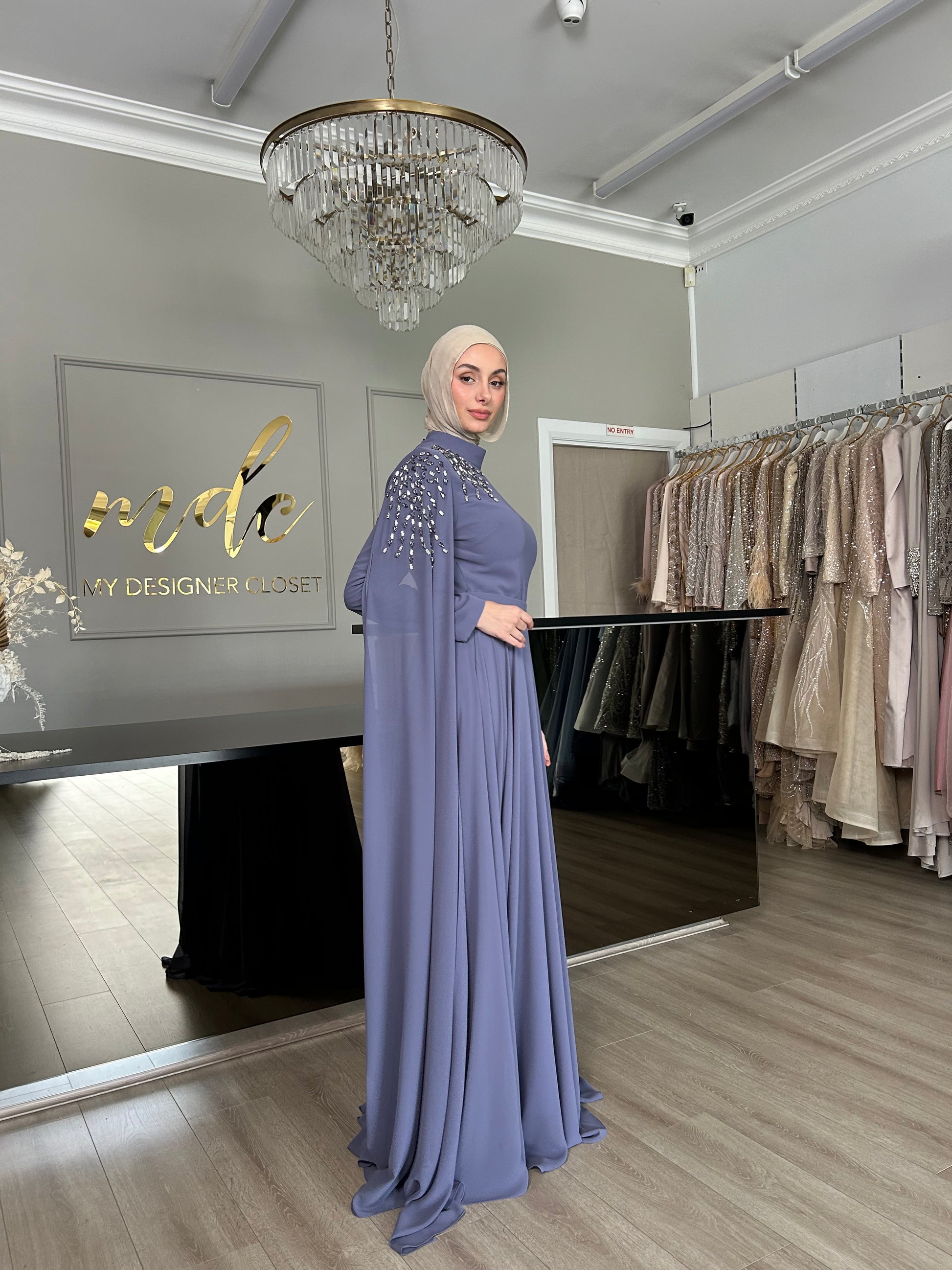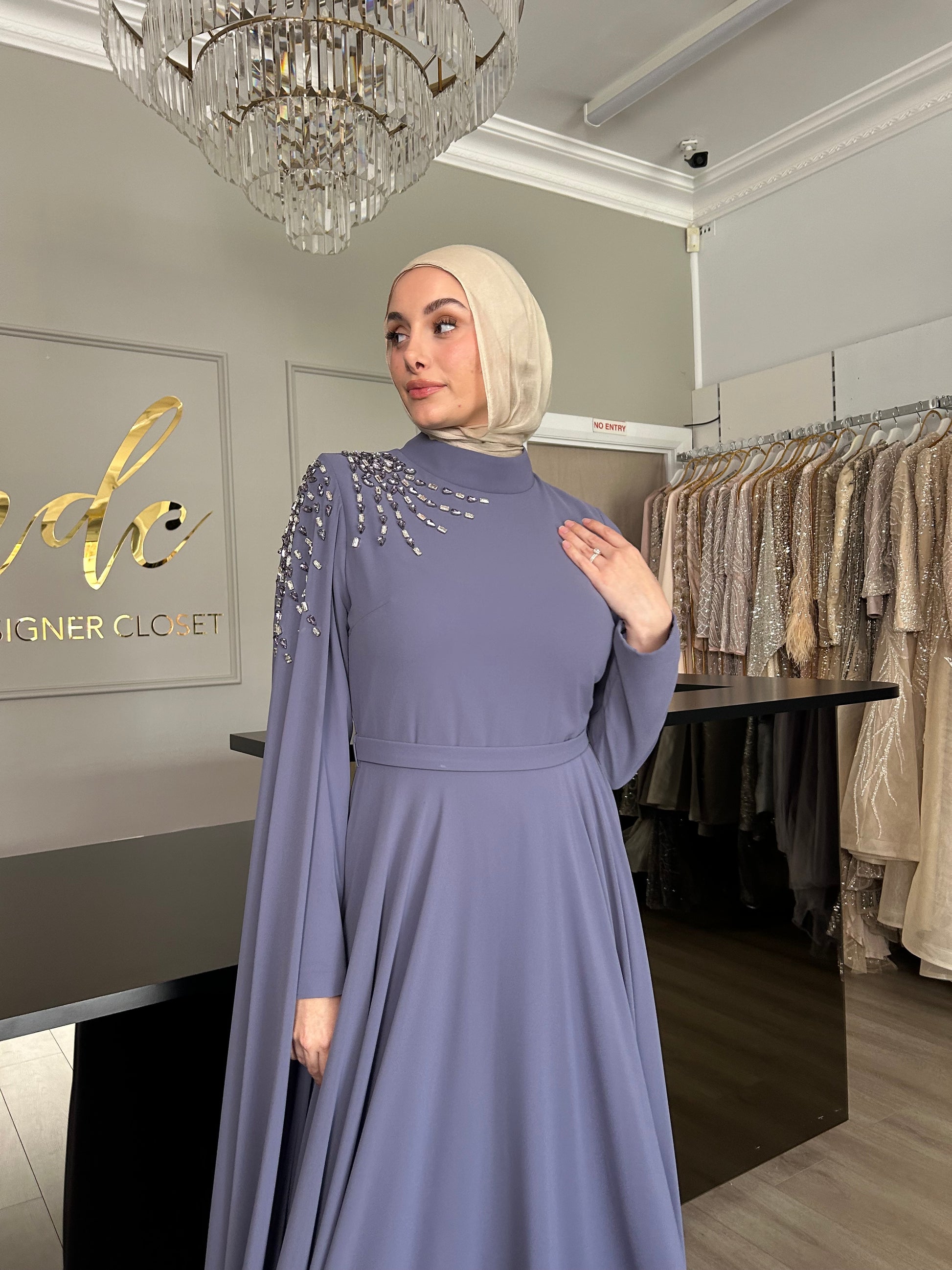 This lavneder gown is pure elegance! With its unique one-sleeve drape and delicate side embellishment, it's the perfect blend of sophistication and style. Make a statement at your next event!