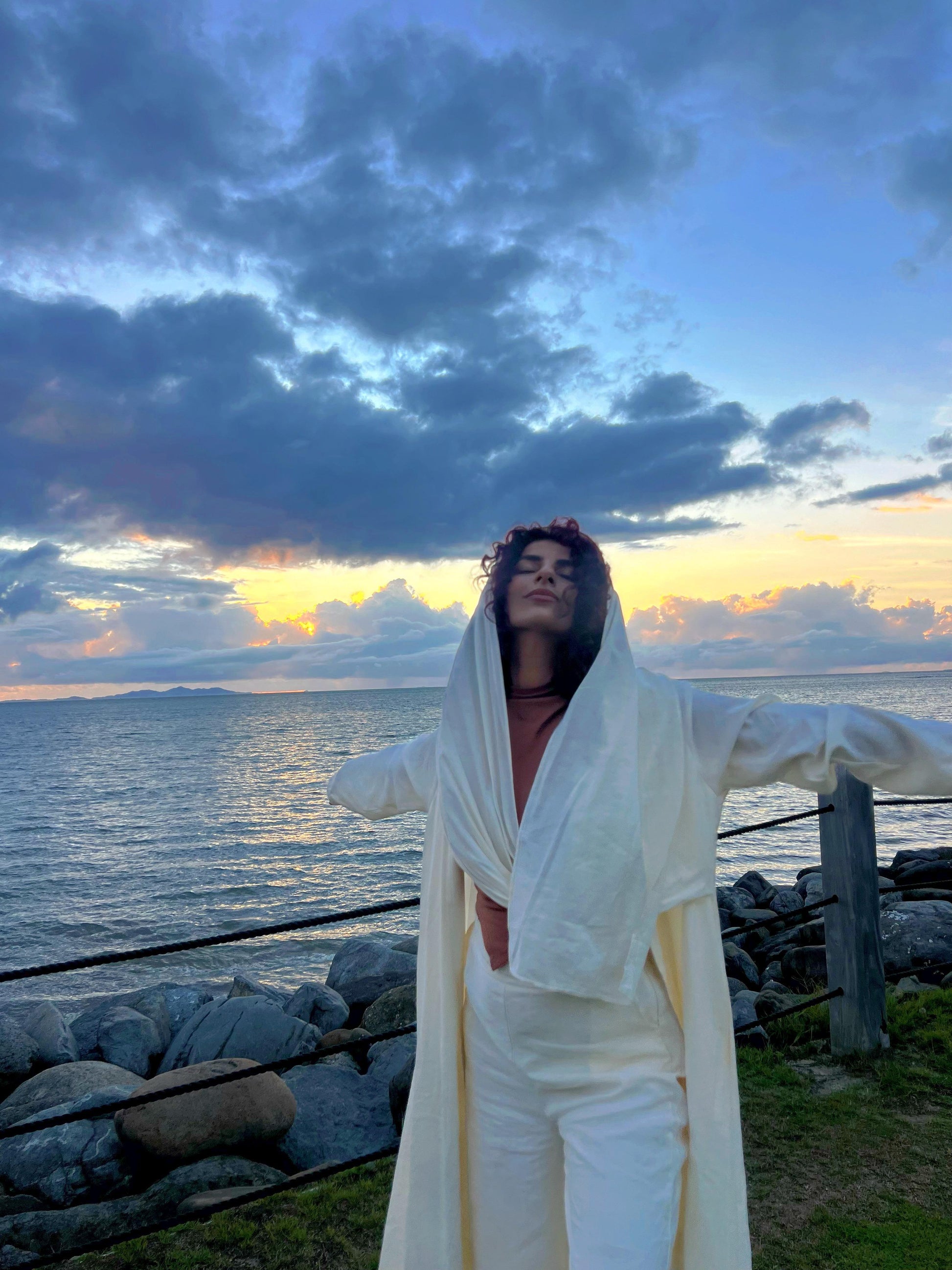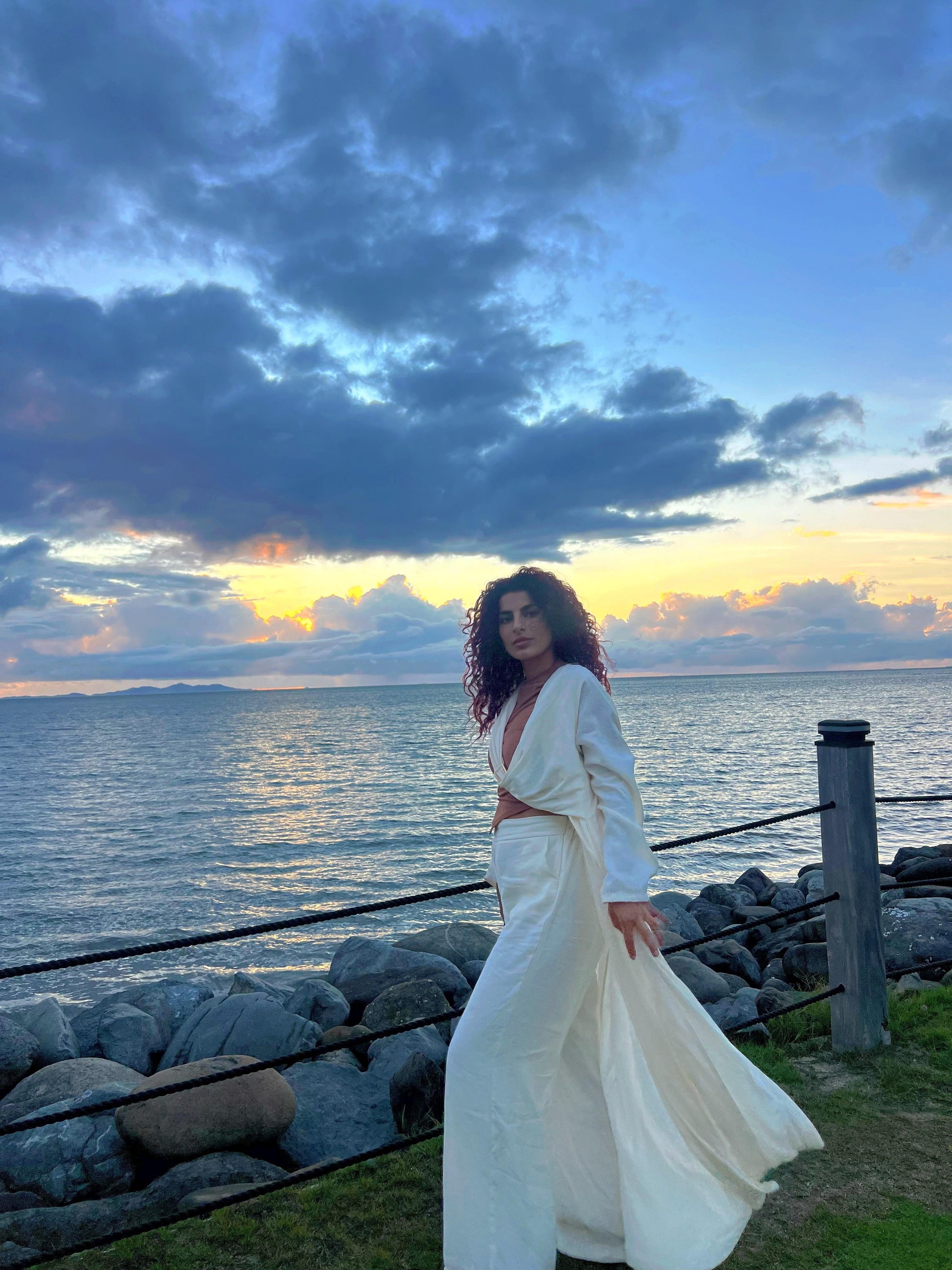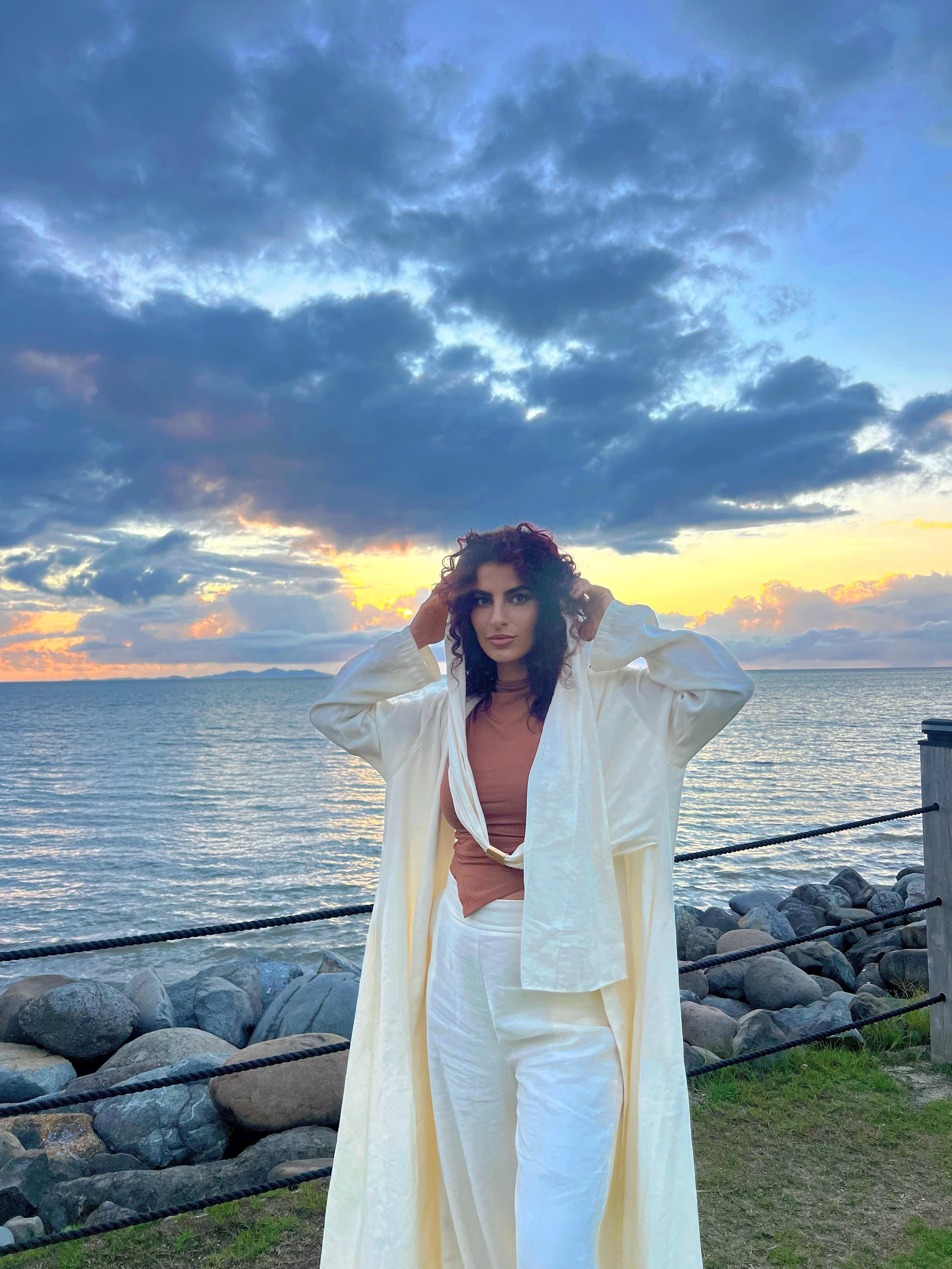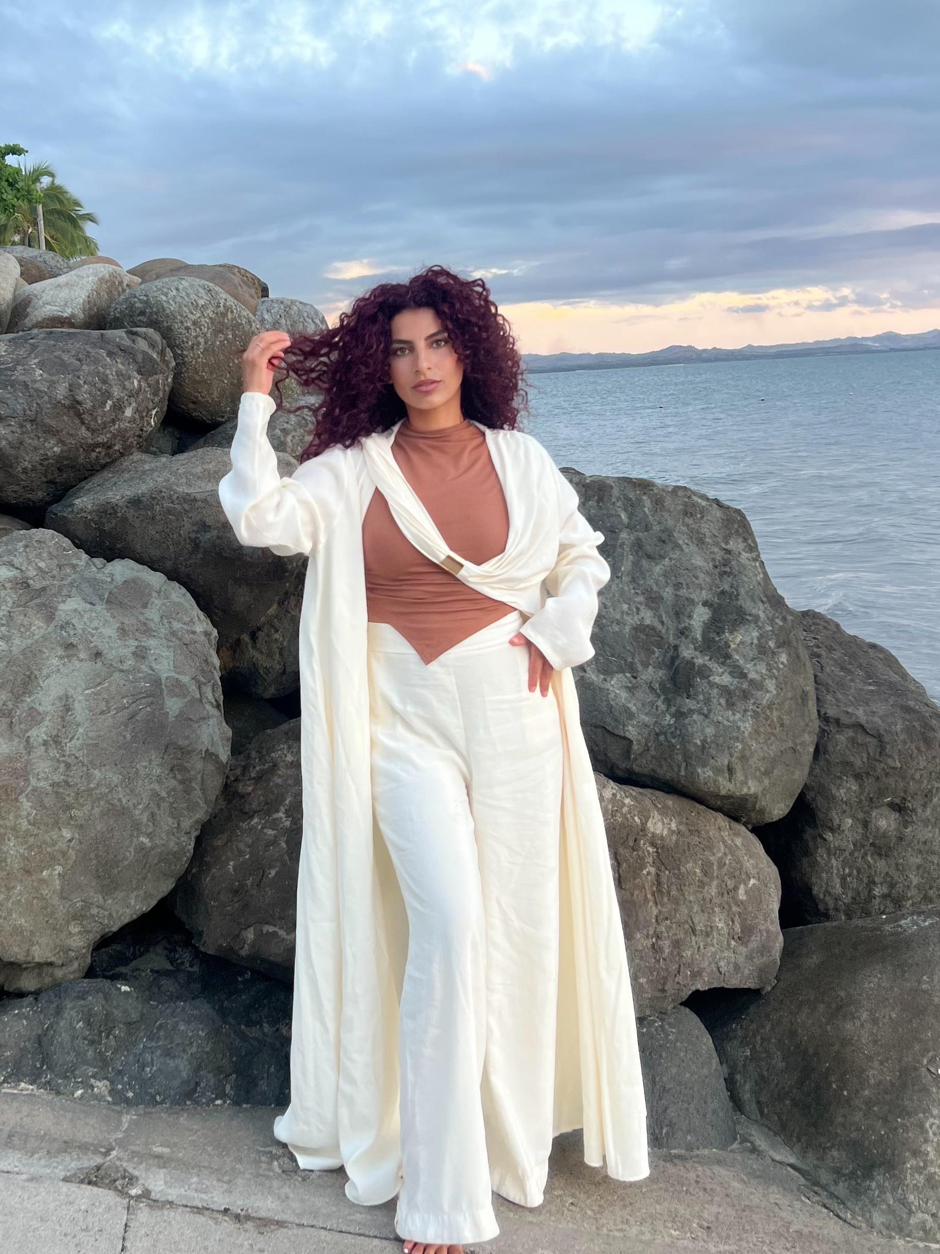 A luxe crème two-piece featuring a long jacket with a gold buckle trail you can throw over your shoulder paired perfectly with matching pants.