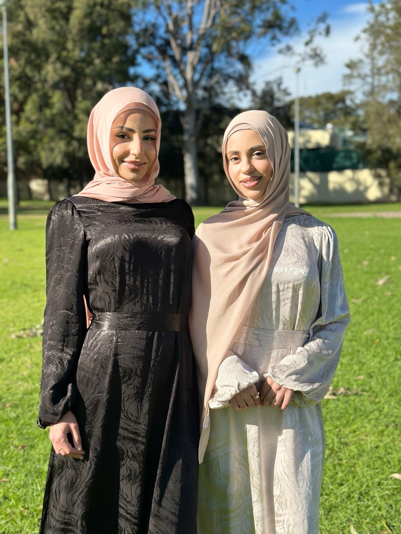 This elegant dress in shimmering silver silk satin features intricate patterns, long sleeves, and a flattering waist belt. Perfect for special occasions.