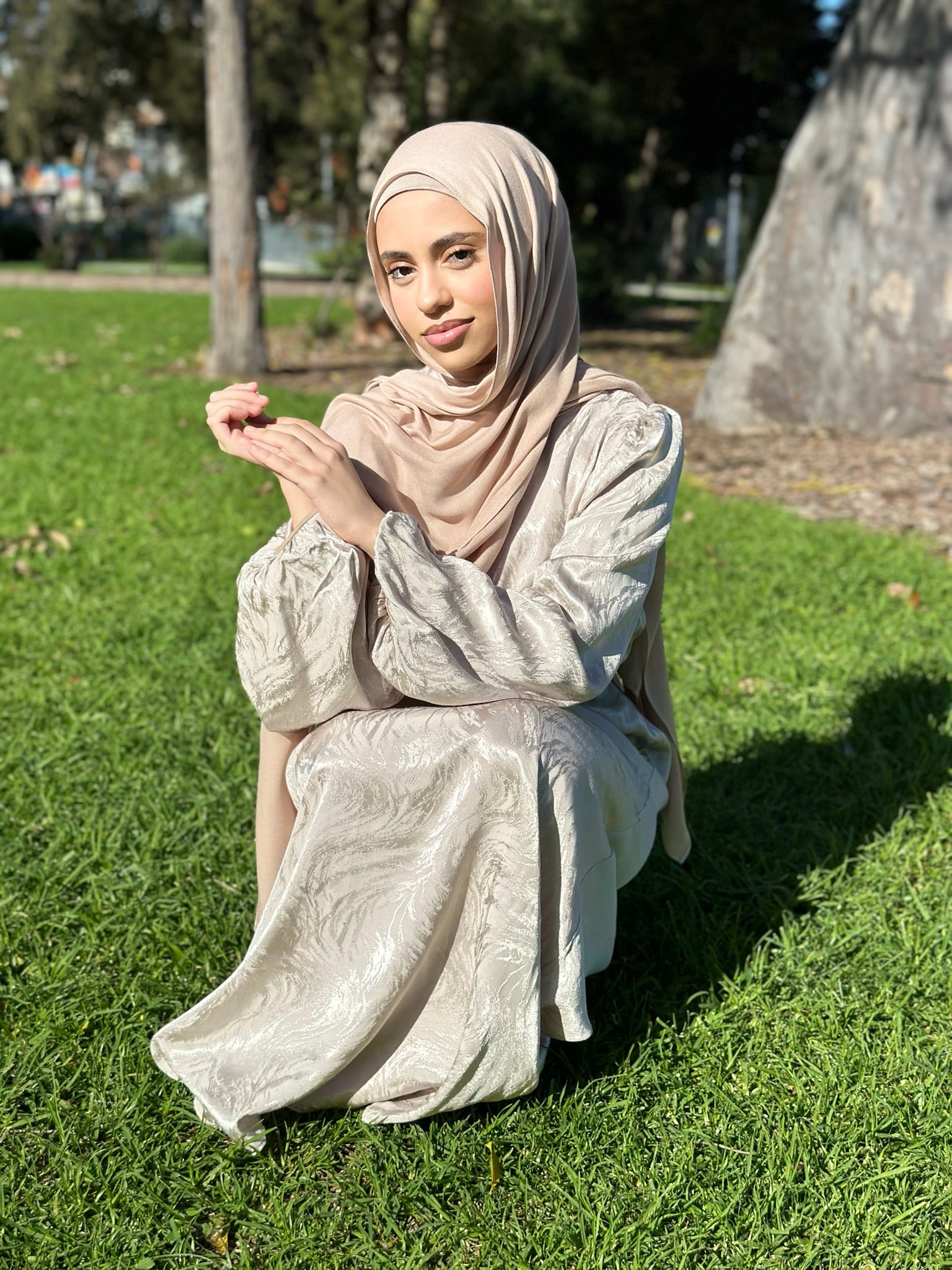 This elegant dress in shimmering silver silk satin features intricate patterns, long sleeves, and a flattering waist belt. Perfect for special occasions.