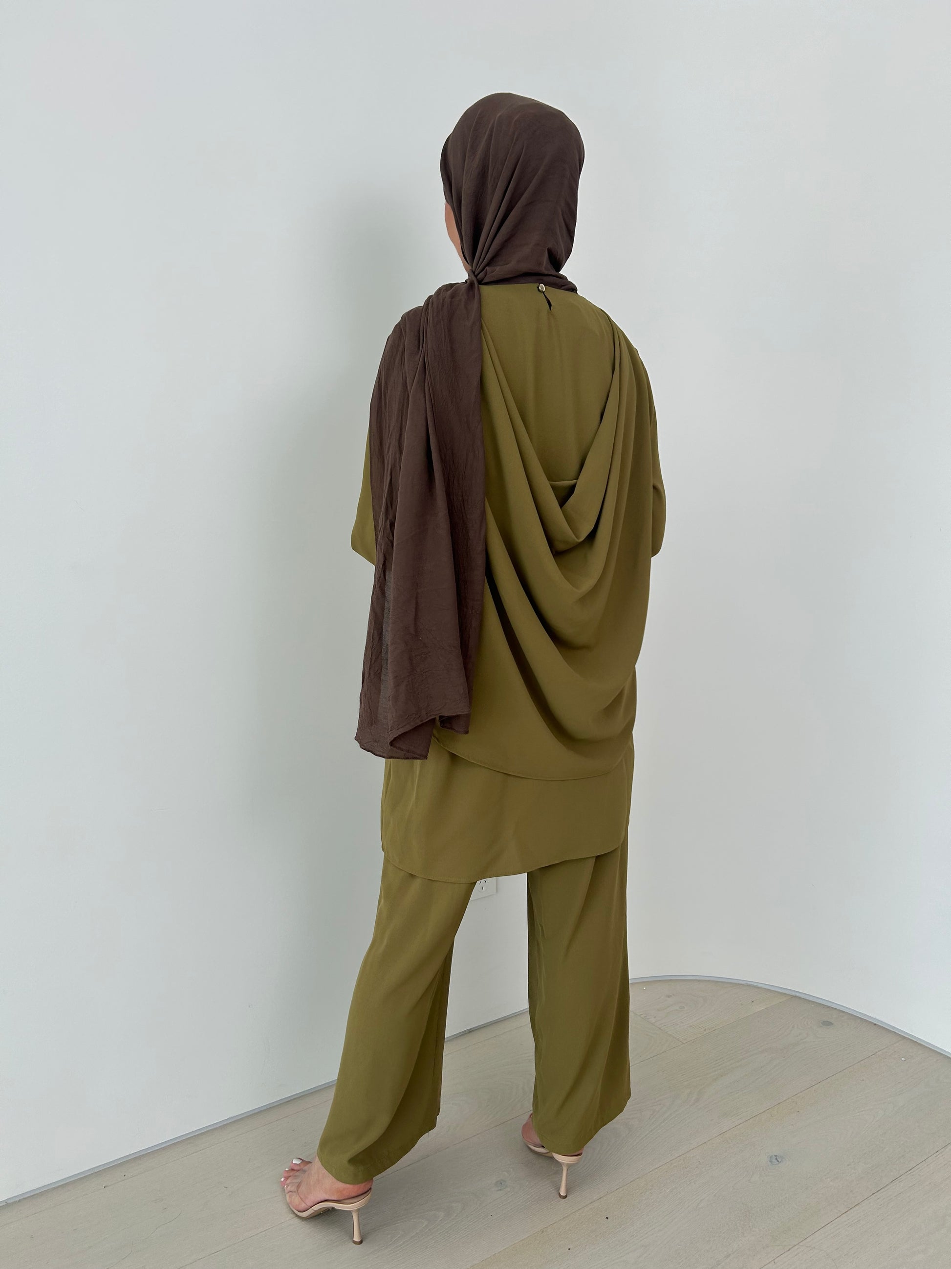 This two-piece set is a perfect blend of comfort and style. The loose-fitting pants offer modesty and ease, while the top features a chic double-layered front and a flattering rouged back. Crafted from high-quality materials, this ensemble is a versatile addition to any wardrobe.